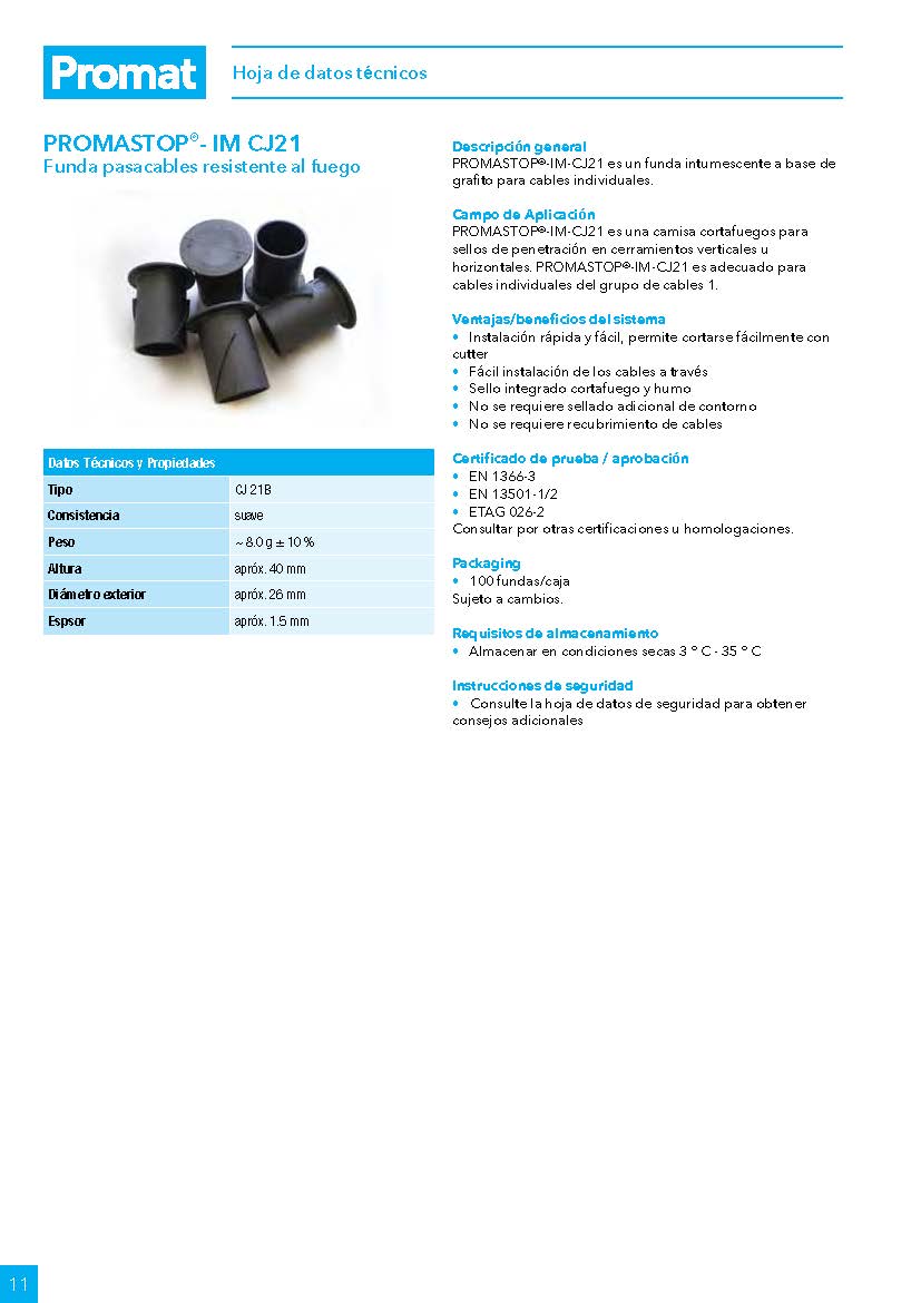 PROMASTOP ® -IM-CJ21 es una chaqueta ignífuga para sellos de penetración en paredes y pisos. PROMASTOP ® -IM-CJ21 es adecuado para cables individuales del grupo de cables 1.
